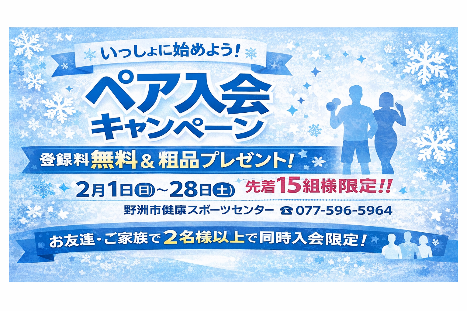 【全会員種別対象】 ペア入会キャンペーン ■2月1日(日)~28日(土) 2月入会者限定! ご家族やお友達同士でフィットネスを始めませんか? 2名以上同時入会で、登録料無料+粗品プレゼント 【手続きに必要な物】 月会費(2ヶ月分)・キャッシュカードまたは、口座番号のわかるもの ご案内チラシはこちら